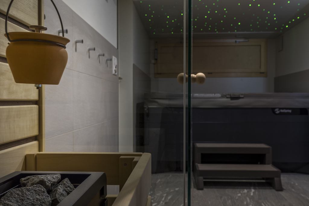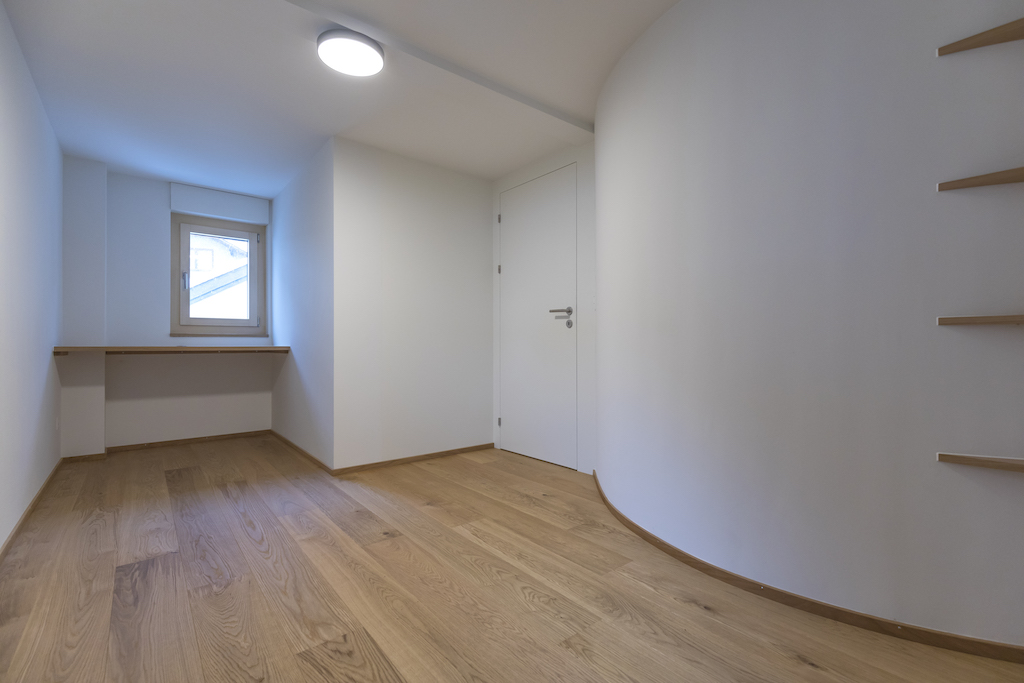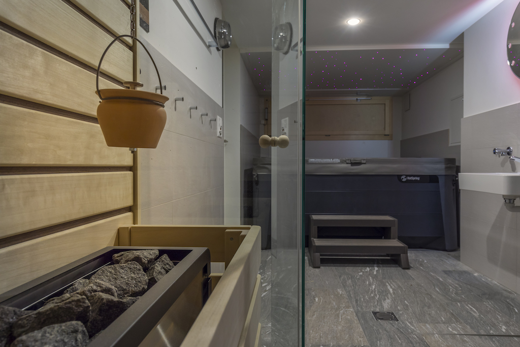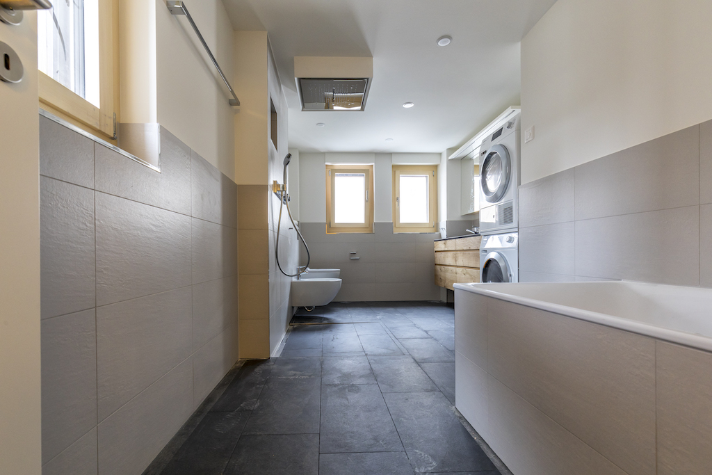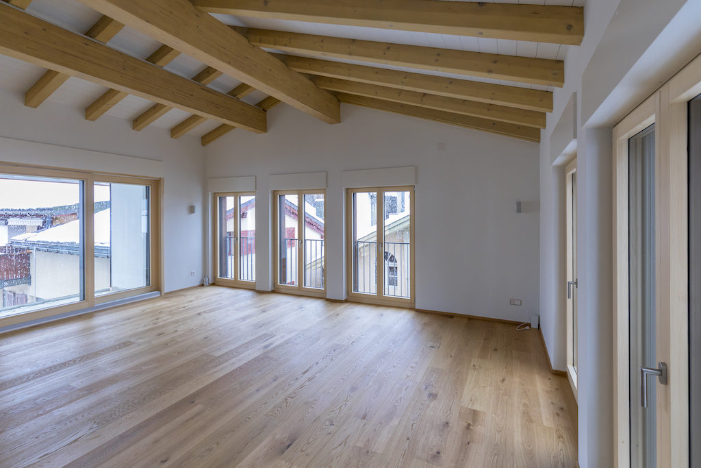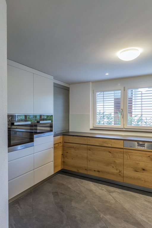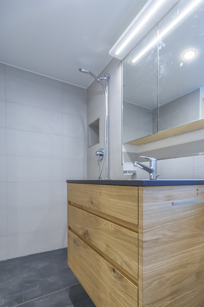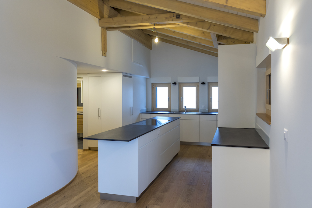 Heller Ausbau mit sichtbarer Holzbalkendecke und großer Raumhöhe, offener Wohn-/Essbereich mit Ofen. Neue, reduzierte Küche in Weiß mit Kochinsel und dunkler Arbeitsplatte. Neue Bäder mit großformatigen, grauen Platten, begehbaren Duschen und Holzmöbeln. Sauna-/Wellnessbereich, Einbauten/Schränke, sowie eine geschwungene Treppe mit integrierter Beleuchtung; zudem Balkone an der Holzfassade sichtbar.