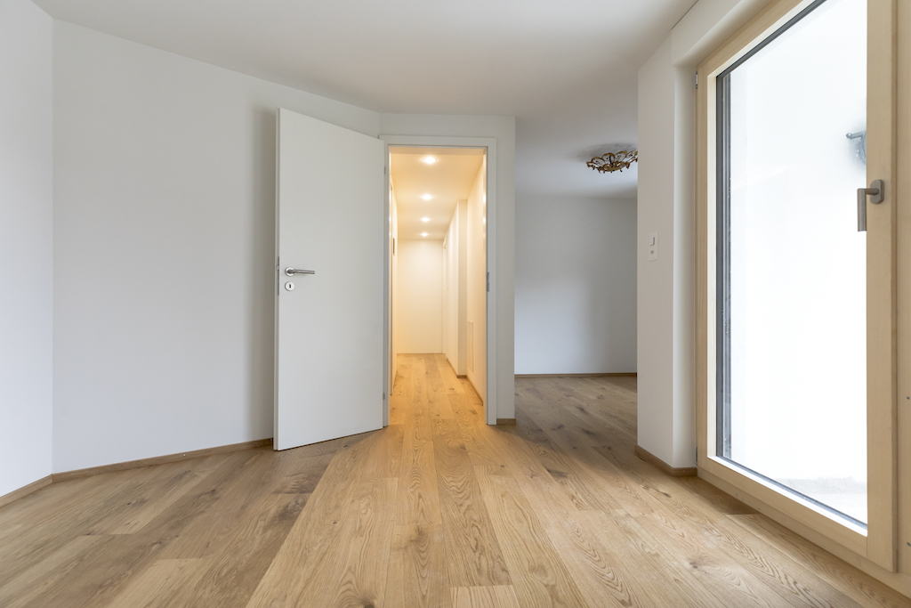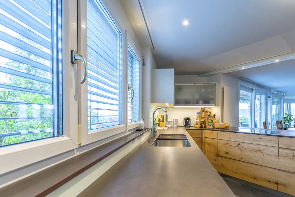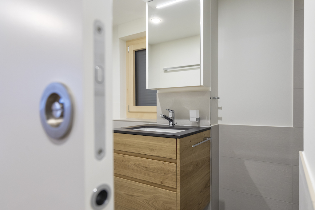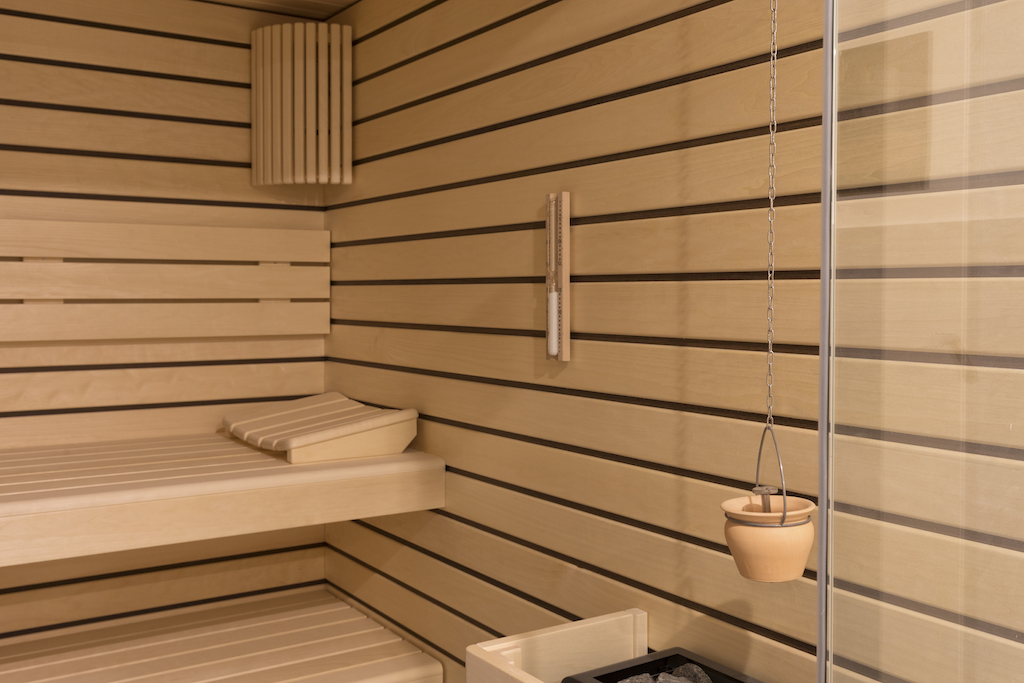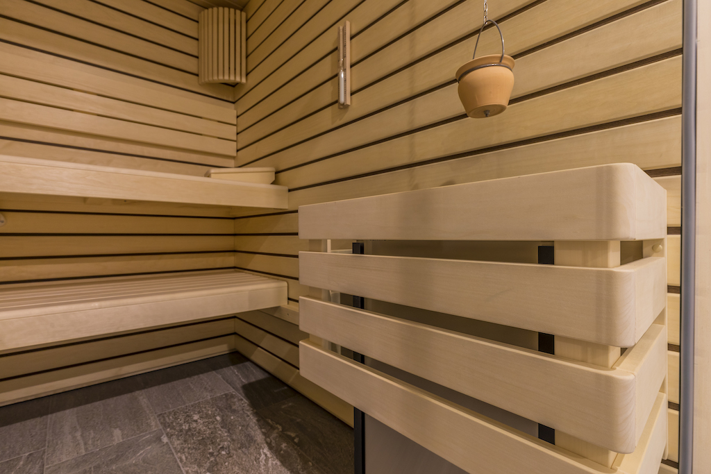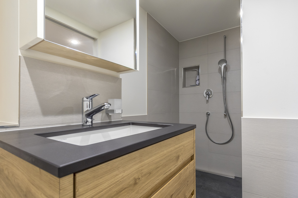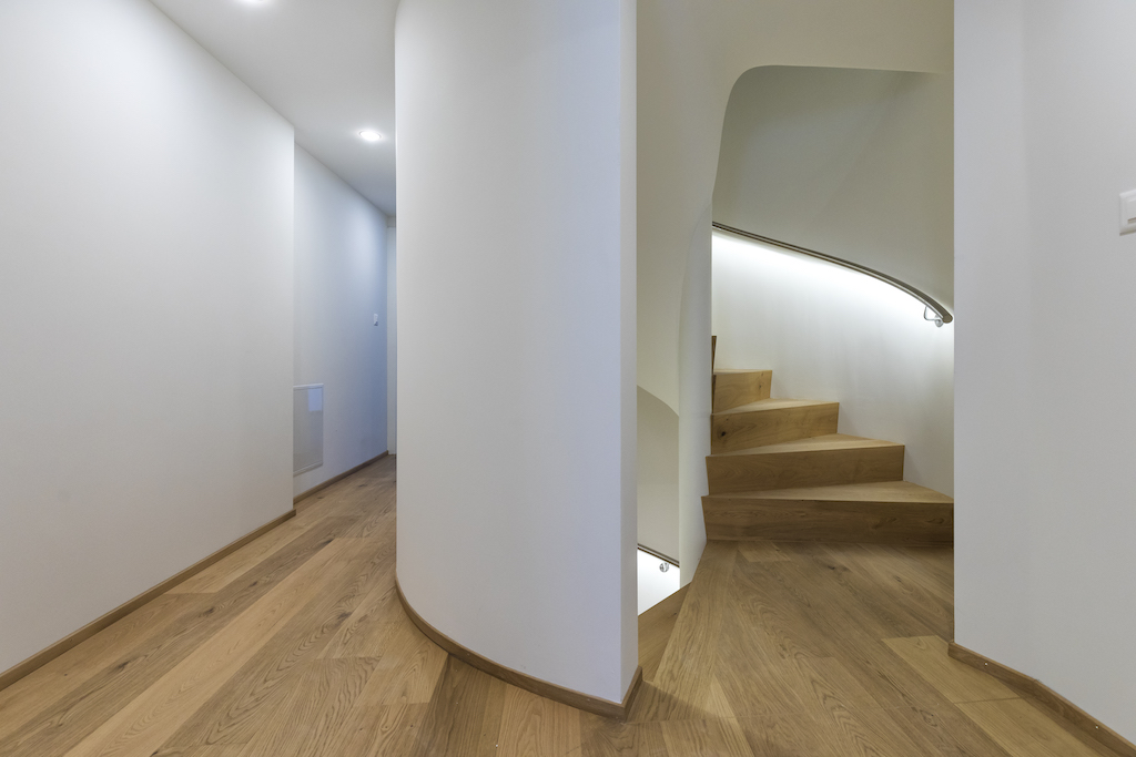 Heller Ausbau mit sichtbarer Holzbalkendecke und großer Raumhöhe, offener Wohn-/Essbereich mit Ofen. Neue, reduzierte Küche in Weiß mit Kochinsel und dunkler Arbeitsplatte. Neue Bäder mit großformatigen, grauen Platten, begehbaren Duschen und Holzmöbeln. Sauna-/Wellnessbereich, Einbauten/Schränke, sowie eine geschwungene Treppe mit integrierter Beleuchtung; zudem Balkone an der Holzfassade sichtbar.